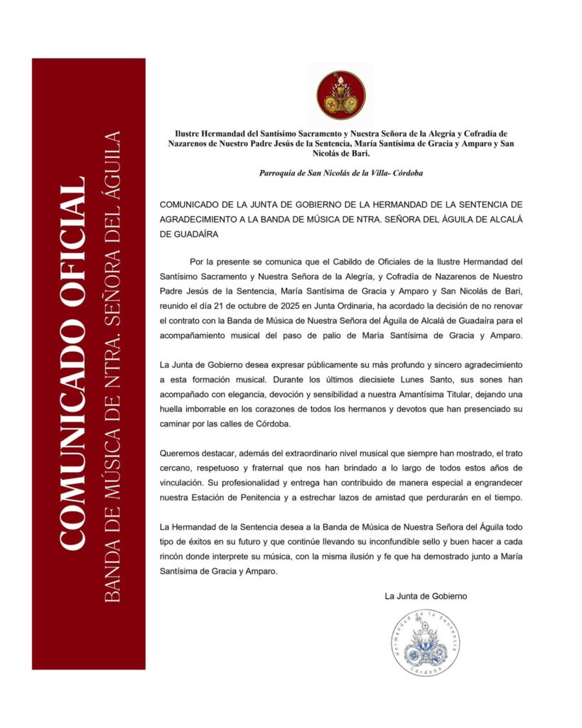 Por la presente se comunica que el Cabildo de Oficiales de la Ilustre Hermandad del Santísimo Sacramento y Nuestra Señora de la Alegría, y Cofradía de Nazarenos de Nuestro Padre Jesús de la Sentencia, María Santísima de Gracia y Amparo y San Nicolás de Bari, reunido el día 21 de octubre de 2025 en Junta Ordinaria, ha acordado la decisión de no renovar el contrato con la Banda de Música de Alcalá de Guadaíra para el acompañamiento musical del paso de palio de María Santísima de Gracia y Amparo.